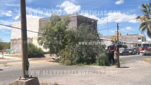 DELICIAS.- La caída de un árbol provocó el cierre parcial de la circulación en la entrada principal del fraccionamiento Cumbres Del Deporte, lo que generó la movilización de cuerpos de emergencia la tarde de este día.